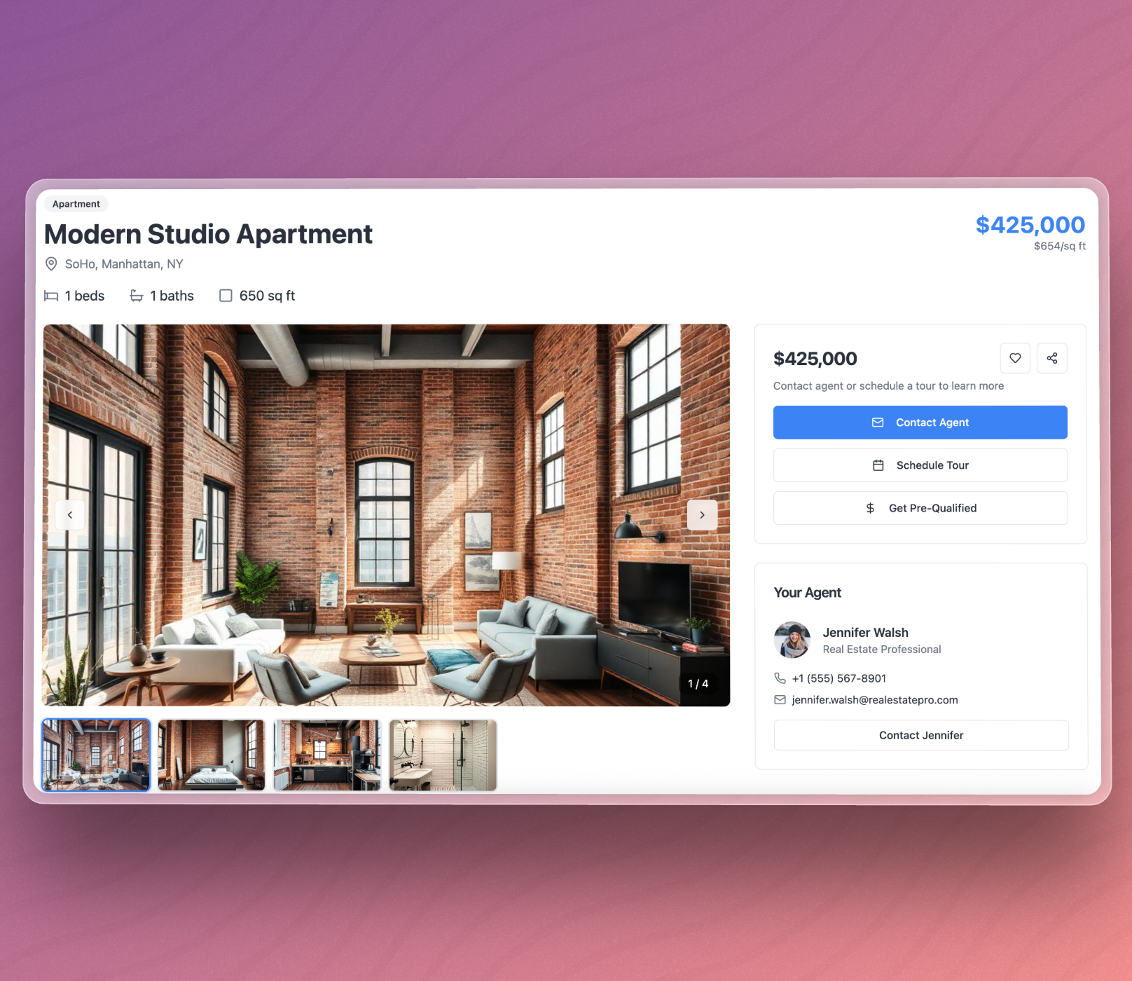 Frontend Implementation: Next.js dynamic routes create individual pages for each property using slug or ID in URL. Detail page includes image gallery with main large image and thumbnail strip, property specifications grid, location map embedded via Google Maps or Mapbox, neighborhood information section, similar properties carousel, and contact form or schedule viewing button.