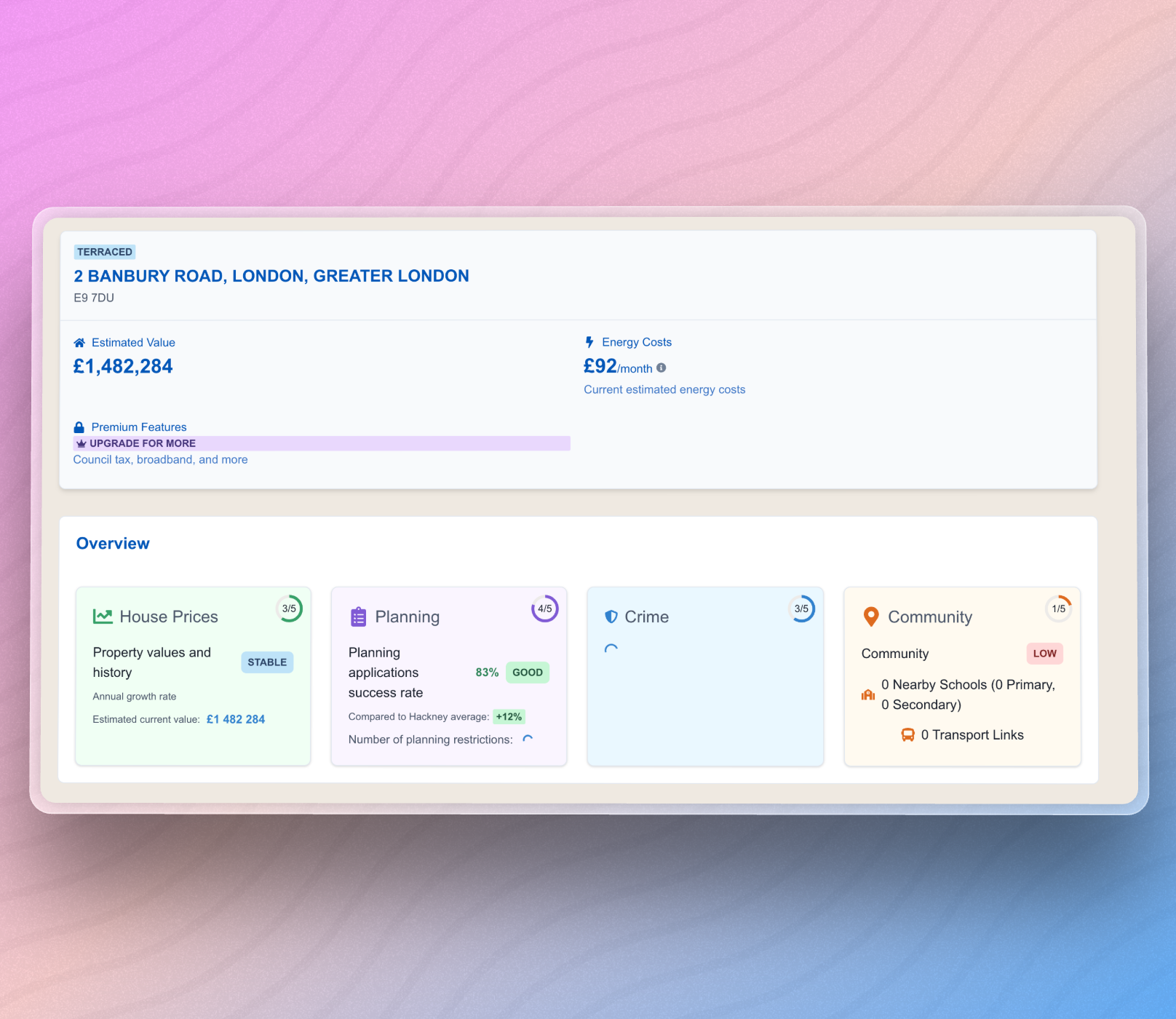 Data Sources: Land Registry API for property prices and ownership, Police UK API for crime statistics, Planning Portal and local council APIs for planning applications, Postcode API for address validation and geocoding, Census API for demographic data, and Ofsted API for school ratings.