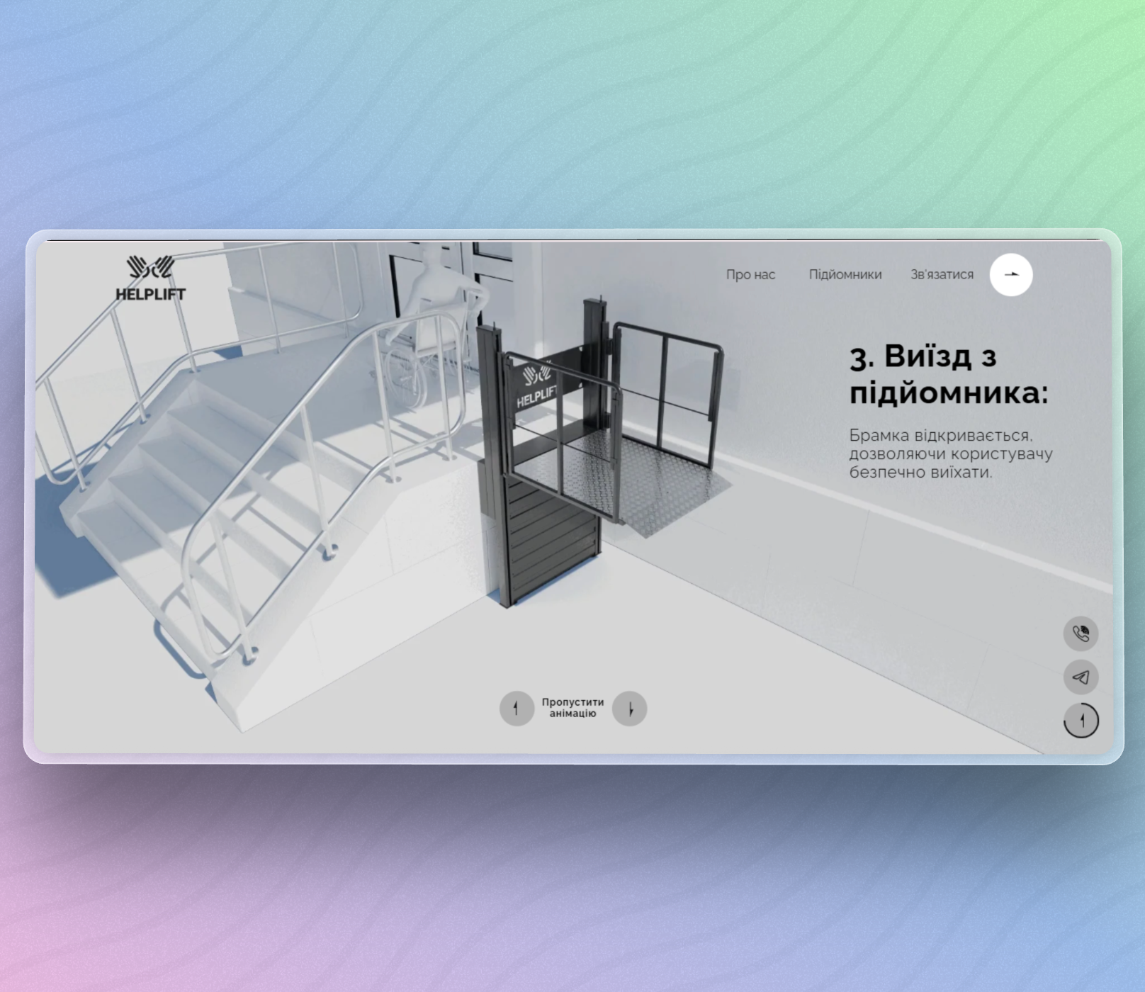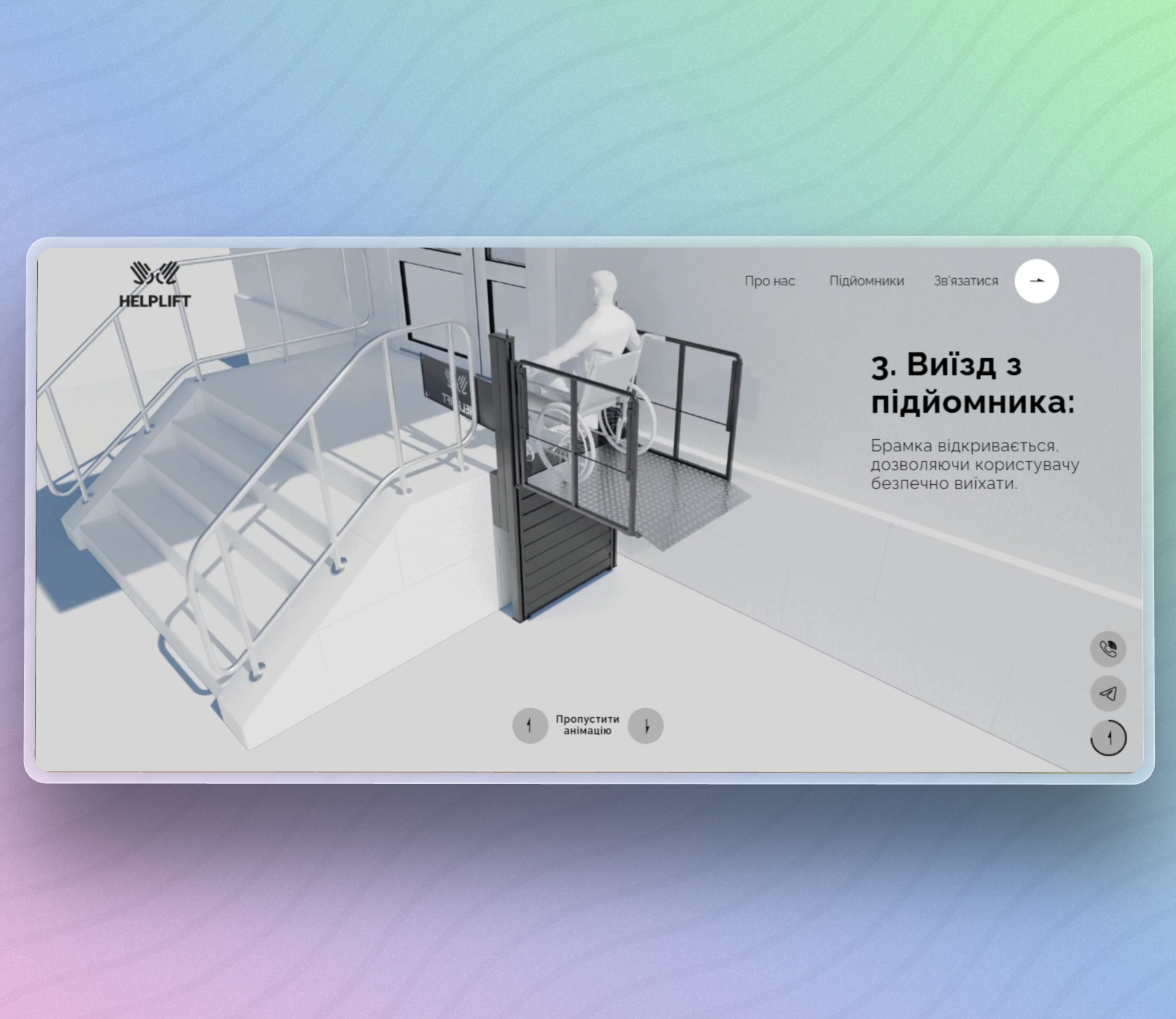 Three lift variants (standard platform, medical stretcher, rotating platform) from 45,000-55,000 UAH. Solves accessibility challenges for buildings without elevators.
