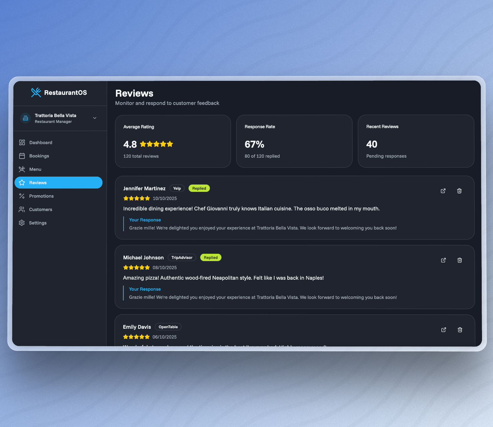 Aggregates customer reviews from multiple platforms like Yelp, TripAdvisor, and OpenTable into a single feed. The system displays the average rating, total reviews, and response rate. Managers can read all reviews and post public replies directly from the dashboard, helping to maintain a positive online reputation.