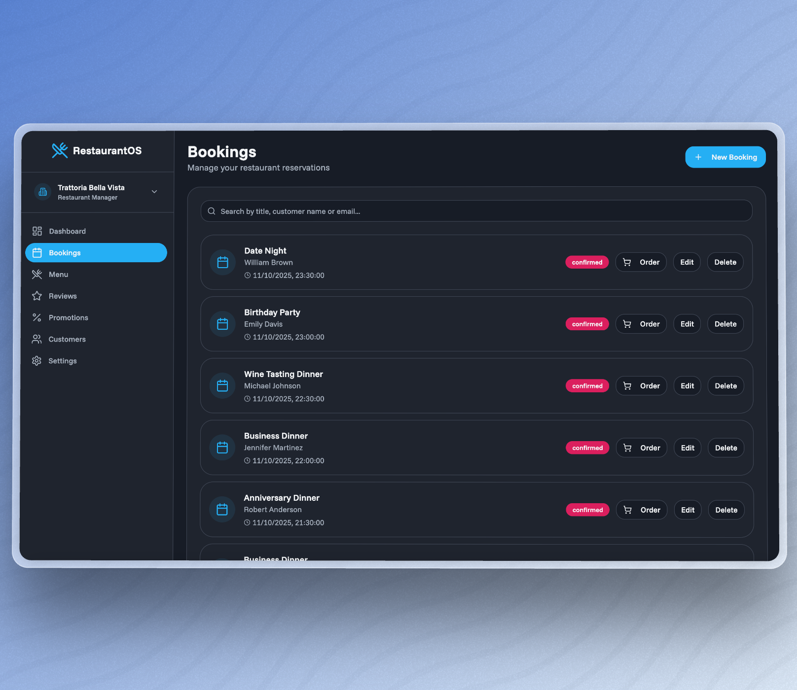 A complete system for managing all restaurant reservations. Managers can create new bookings, view a list of all upcoming reservations with their status (confirmed, pending, etc.), and manage details for each booking, such as the customer’s name and the event type (e.g., Date Night, Birthday Party). The system helps prevent overbooking and ensures a smooth seating process.