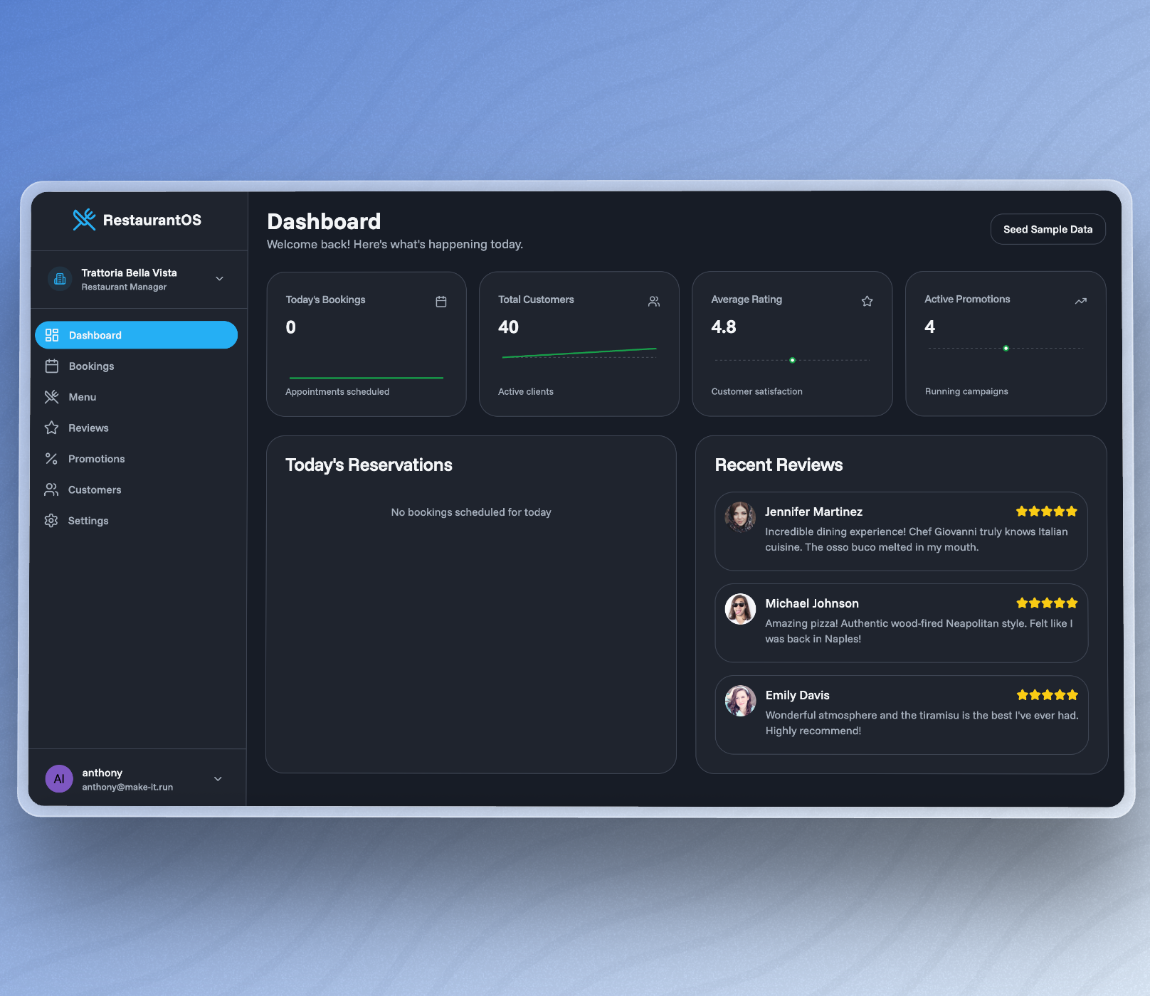 RestaurantOS is a comprehensive restaurant management platform designed to centralize and streamline all aspects of restaurant operations. Built with a modern stack including React.js, Nest.js, and MySQL, the platform provides restaurant managers with a unified solution for handling bookings, menus, customer reviews, promotions, and customer data. By integrating these key functions, RestaurantOS helps improve operational efficiency, enhance the customer experience, and provide data-driven insights to boost profitability.