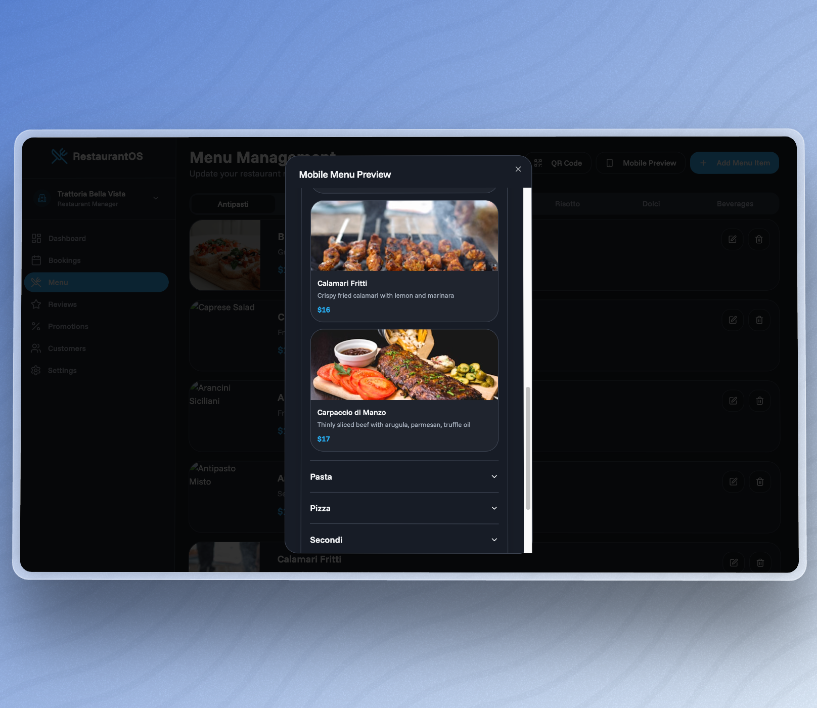 Allows for easy creation and management of the restaurant’s menu. Managers can add new menu items, set prices, write descriptions, and upload photos for each dish. The platform supports multiple categories like Antipasti, Pasta, Pizza, and Secondi. It also includes a Mobile Menu Preview feature, allowing managers to see how the menu will appear to customers on their mobile devices.